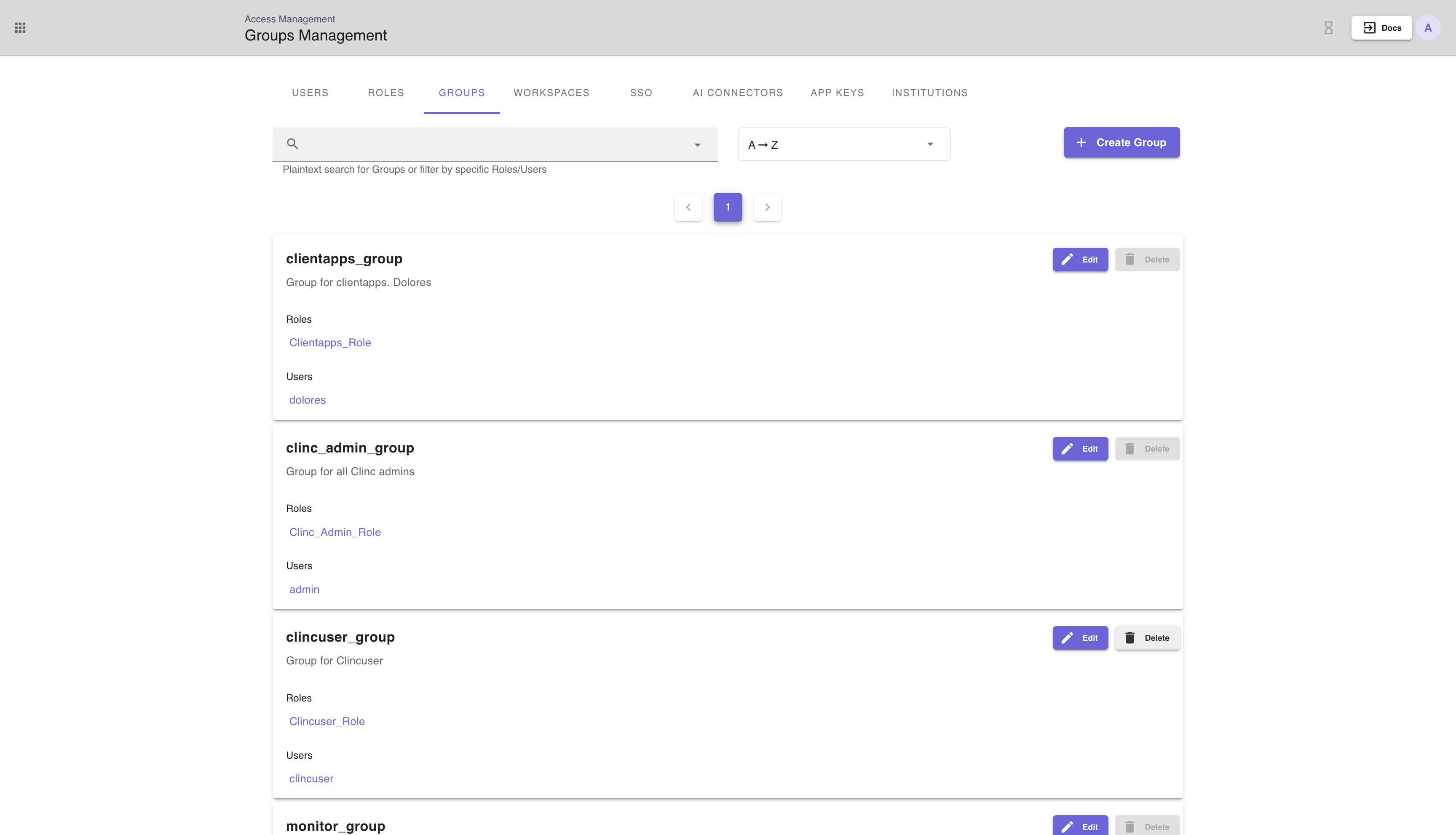 The Groups tab on the Access Management Page (shown above) allows a user to Create, Edit, and Delete Groups. The search bar enables filtering by roles and users, as well as plaintext search for group name. Sorting is additionally available.
